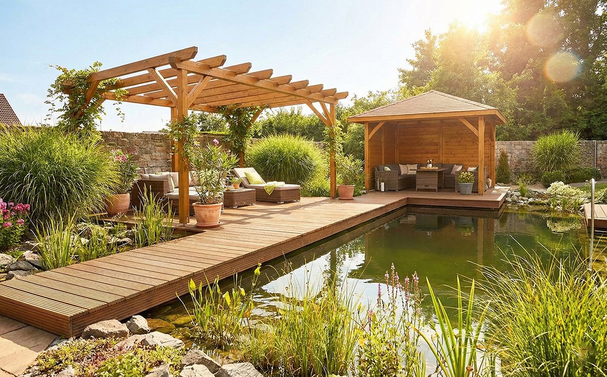 Šalia vandens telkinių dažnai statomos pavėsinės, pergolės ar stoginės, sukuriančios jaukią poilsio zoną ir leidžiančios visapusiškai mėgautis ramybe prie vandens.